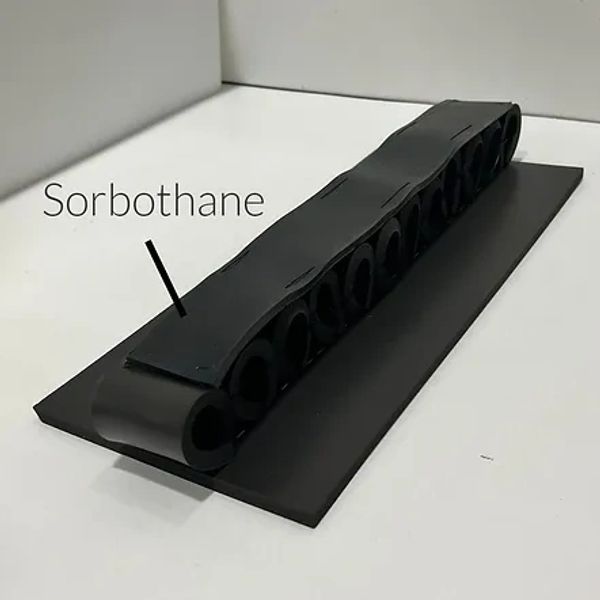 The strip of Sorbothane has significant dampening properties and is therefore used directly on the bone. Sorbothane absorbs up to 94.7 percent of shock energy. Sorbothane is viscoelastic meaning it exhibits properties of both liquids (viscous solutions) and solids (elastic materials). Viscous materials deform under load, transmit forces in all directions, and are unable to recover their shape. Elastic materials deform under load and return back to their original shape when such load or force is removed. The swallowed energy of the Sorbothane turns into a small amount of heat.